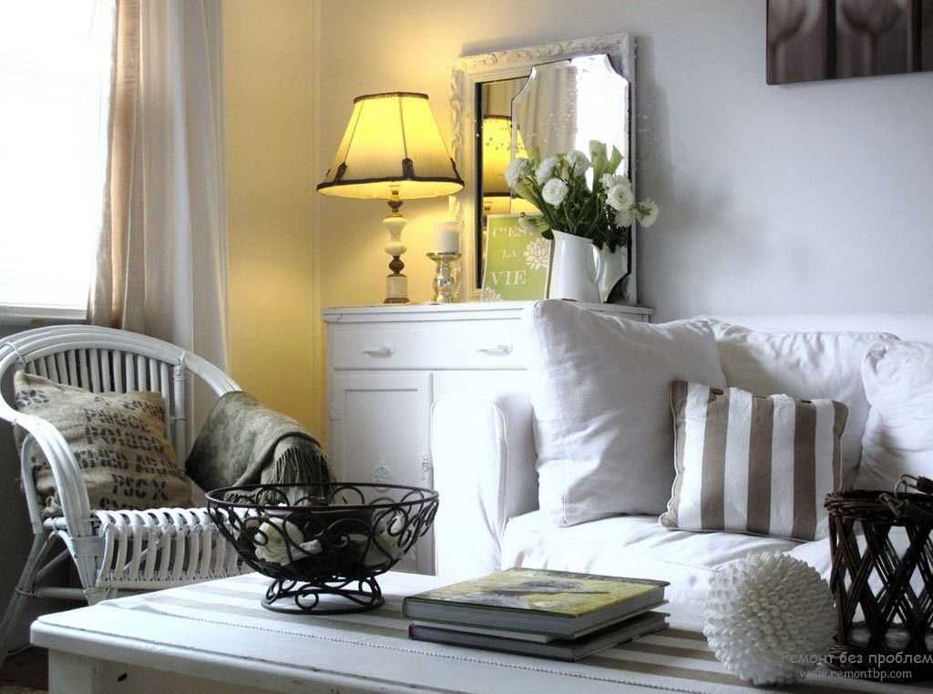 В кухню-столовую можно поставить сервант с застекленными дверками. В гостиную можно поставить диван и одно-два кресла. Причем они не обязательно должны быть из одного гарнитура, наоборот, будут хорошо смотреться разные кресла и диван. Их можно декорировать ажурными подушками. Обивочная ткань мягкой мебели должна быть качественной и натуральной.