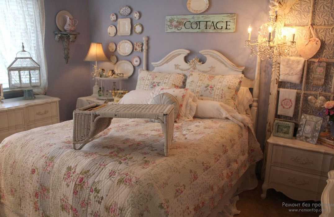 Хорошим решением станет драпировка вокруг кровати, представленная легкой занавеской или балдахином. Такой текстиль может быть использован в качестве штор. Кровать застилается красивым постельным бельем в белом или бежевом исполнении, покрывалом в нежных светлых тонах, украшенным хлопчатобумажными кружевами. Изящно будут выглядеть на спальном ложе декоративные подушки в стиле шебби шик. Под кроватью можно разместить старинные потертые чемоданы, плетеные корзины или коробки с ажурной обивкой.