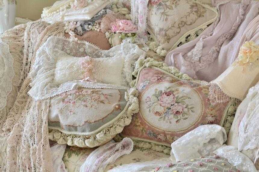 Диваны, кресла, кровати, кушетки украшают подушками, они могут быть из разных материалов: шелка, атласа, ажурные вязанные крючком. Очень часто чехлы подушек имеют изображения ангелочков и роз, их расшивают бантами, рюшами, кружевами и жемчугом.