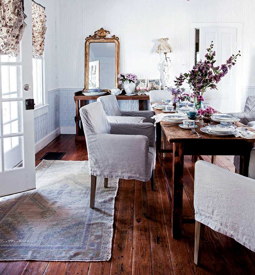 Цвета используются мягкие приглушенные, бледные. Текстиль может быть однотонным, но также приветствуются цветочные принты, полоска, клетка и горох, которые должны больше угадываться, чем бросаться в глаза.