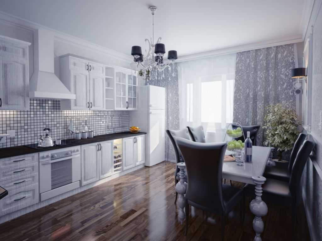 Если же в белом цвете будет оформлена кухня, то ее можно отнести к современному стилю. Пол на кухне можно покрыть светлым паркетом. Так же удачно будут смотреться хромовая посуда.