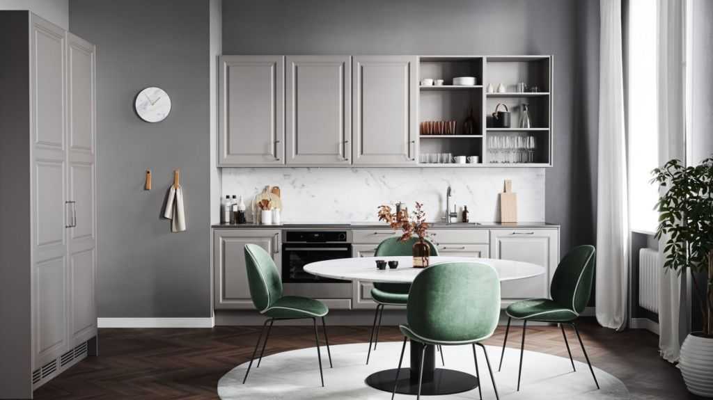 Одним из наиболее часто выбираемых решений является выбор белой кухонной мебели с серой столешницей. Для классической белой мебели вы можете включить серый цвет в виде ручек, который станет декоративным элементом. Еще один способ объединить эти два цвета — сделать верхний и нижний шкафы разными цветами.