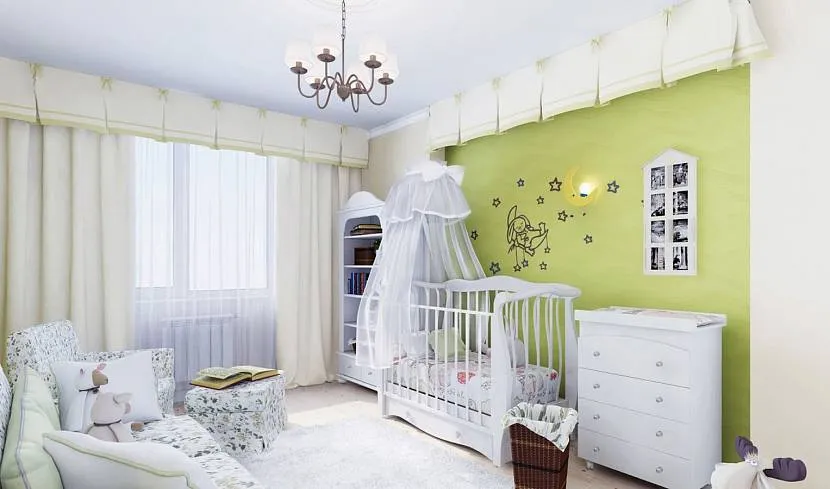 Чаще всего бэби-зону выделяют декором, оформлением стены. Можно задействовать постеры, тканевые гирлянды, декоративные буквы, полочки с игрушками, детские светильники, подвесы и др.