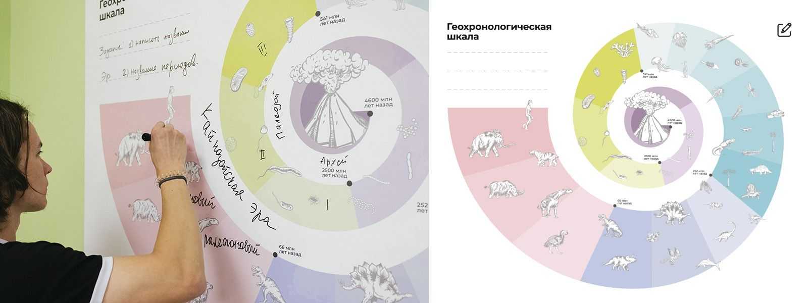 В геохронологической шкале та же идея, что и в таблице Менделеева. Ученики могут подписывать название эр, периодов, название ископаемых животных и даже что-то подрисовывать.