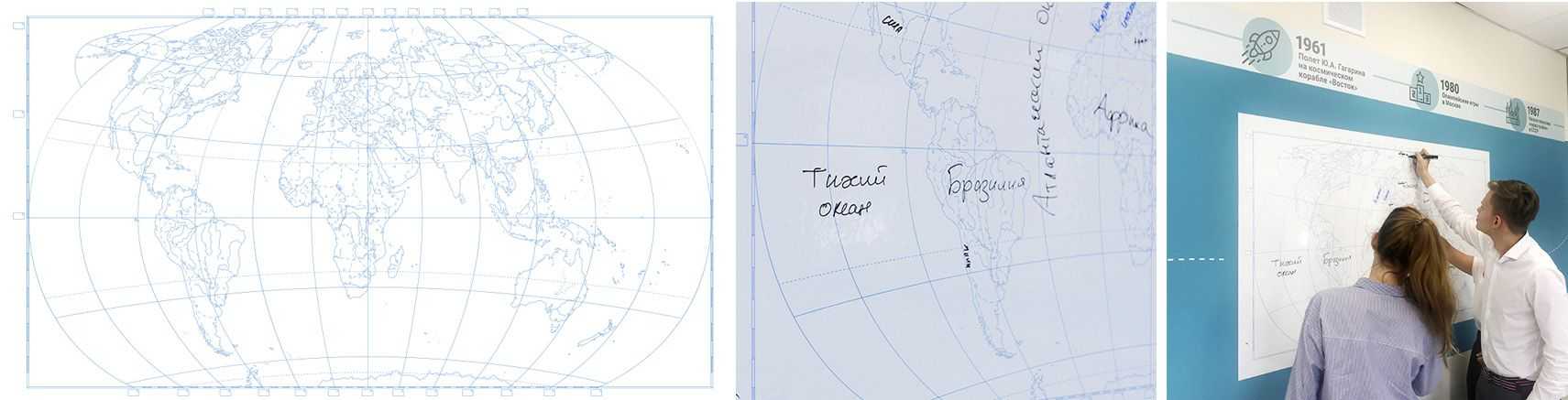 На стенке, противоположной доске, мы разместили материалы для коллективной работы, они покрыты маркерной пленкой — можно писать разными цветами и стирать. Это очень удобно.