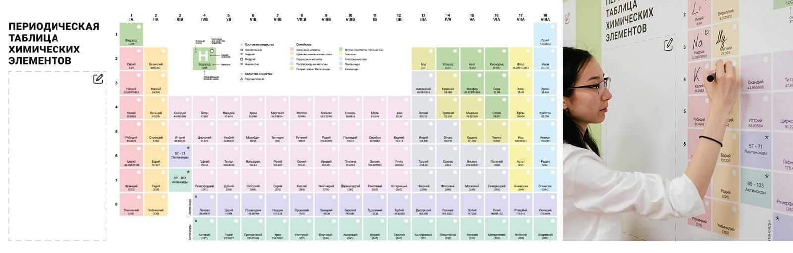 Таблица Менделеева, частично “слепая” – в ней нет обозначения самих элементов. Как дальше с ней работать – вопрос к фантазии учителя. Слева находится поле, на ней можно писать задание по таблице, и ученики могут отмечать на ней решения. Например, отметьте пары элементов обладающих сходными свойствами. Или обведите щелочные металлы.