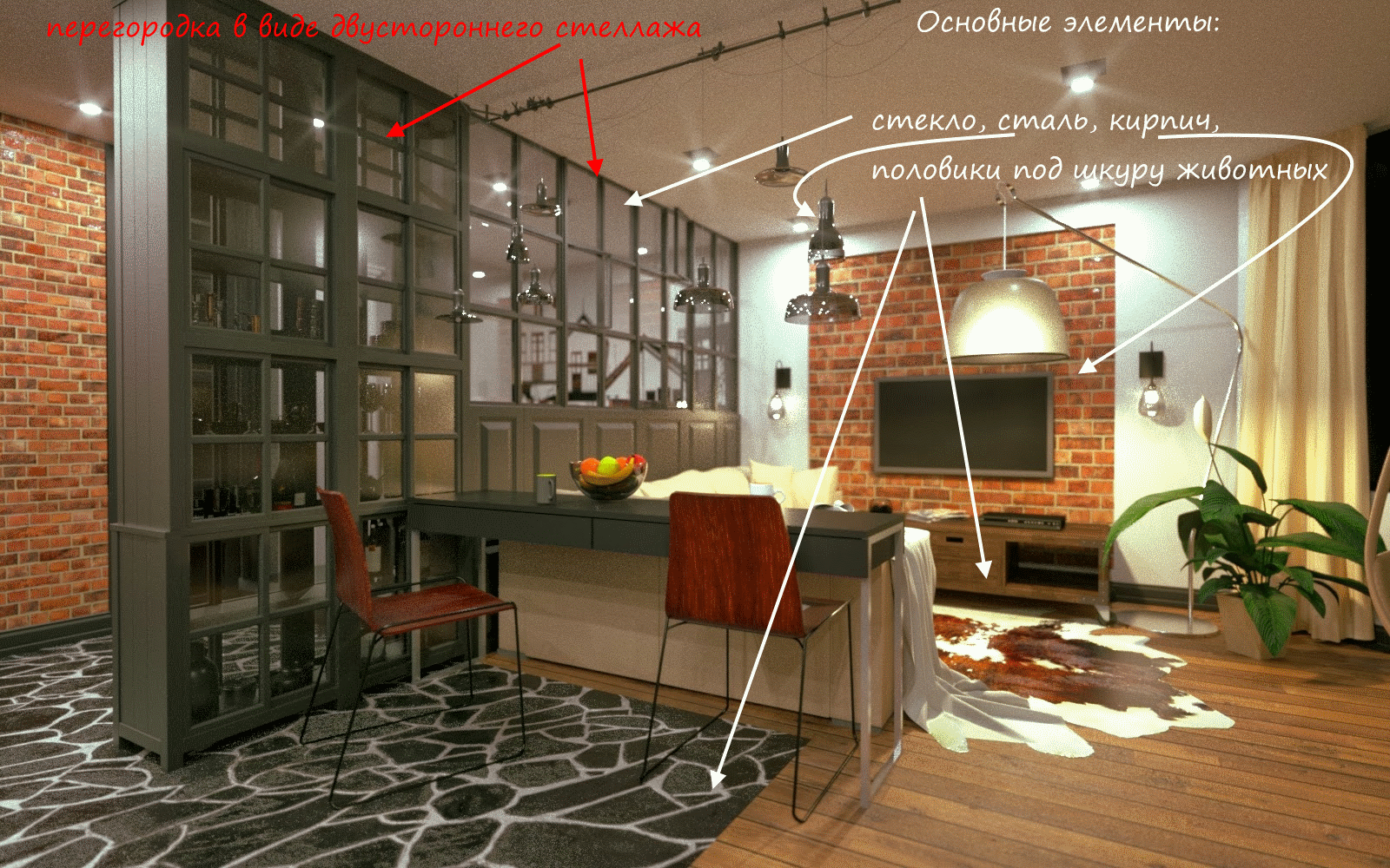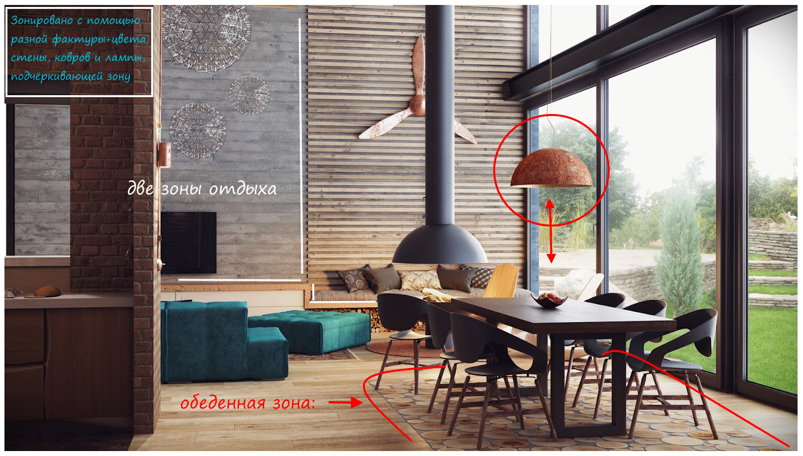 Разные фактуры хороши для зонирования и декора, но не злоупотребляй сложными сочетаниями. Например, оставь одну красную кирпичную стену на общем бетонном фоне. Так можно обозначить зону отдыха, рабочий уголок, обеденную зону – что угодно.