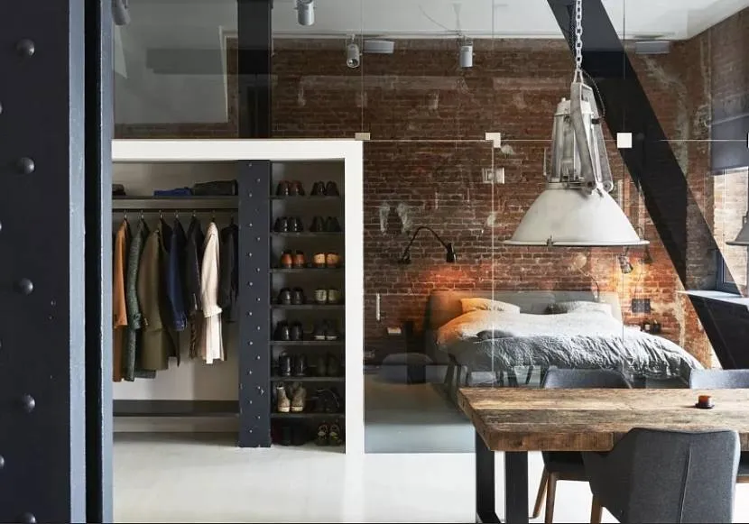 Большая комната в стиле «Лофт» вмещает все: это и спальное место, и гардеробная, и гостиная, и рабочий кабинет.