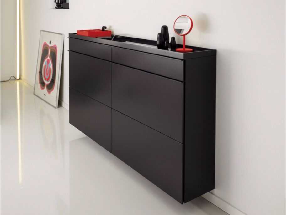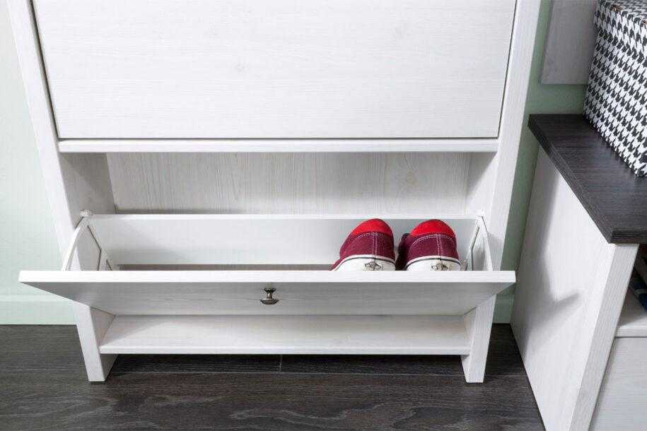 Один из способов скрыть обувь от глаз и от пыли, но такая конструкция займет больше места, чем полка — ведь для выдвижения ящика нужные дополнительные механизмы и крепления. Еще один похожий вариант — выдвижные полки. Это почти то же самое, что и ящики.