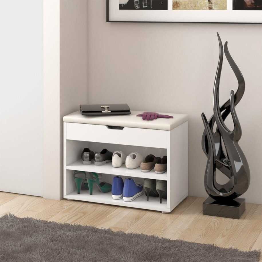 Тумба с местом для сидения. Конструкция может быть разной, но в ней есть полки для обуви и мягкое место, куда можно присесть, чтобы обуться.