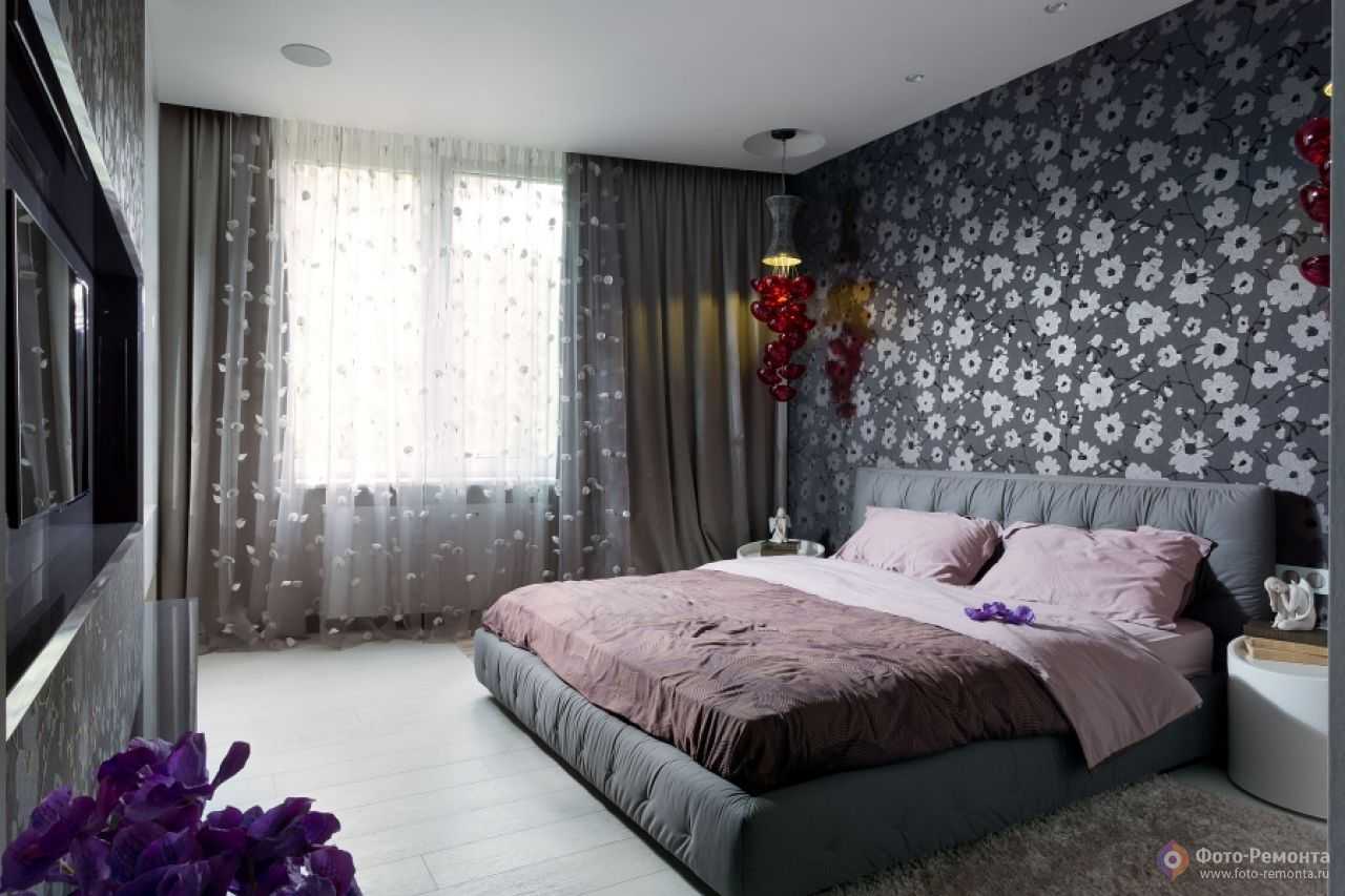 При использовании различных видов обоев нужно обязательно перед этим разработать дизайн-проект квартиры, который должен соответствовать выбранной стилистике и масштабов спальни. Темно-серые обои с крупным рисунком идеально подойдут для спальни в классическом стиле.