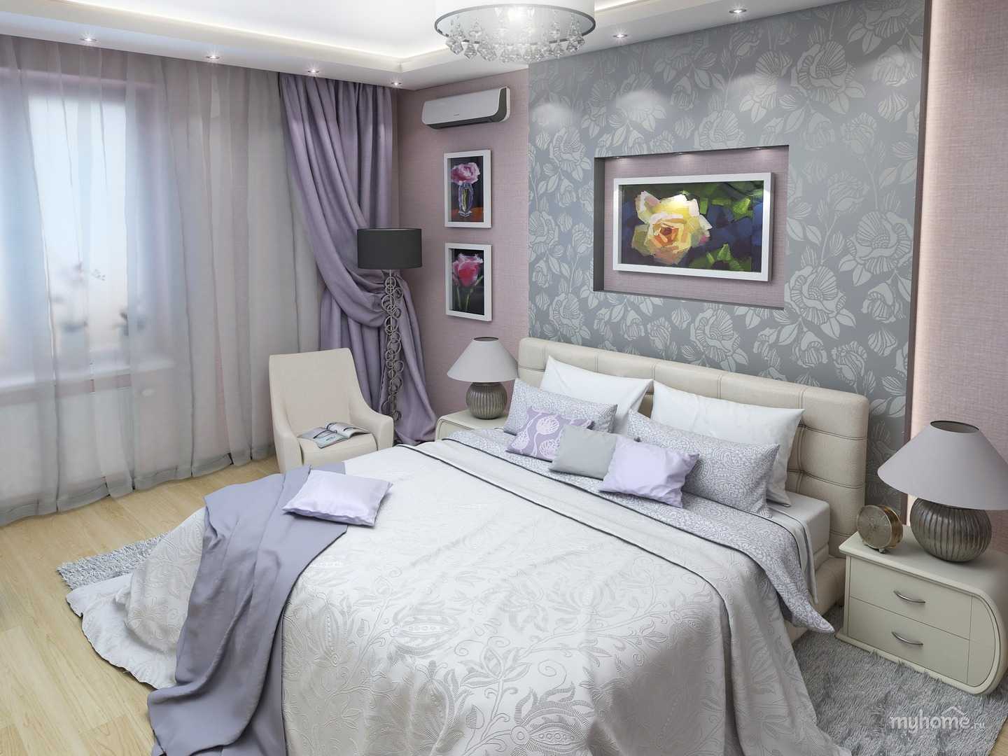 Серая спальня с фиолетовыми акцентами довольно приятна. Обои в таком декоре могут быть не тусклыми, а отливать серебром. В таком же контексте может быть подобрана и мебель с покрывалом. Серо-розовые решения тоже мягкие, если используются нежные оттенки.
