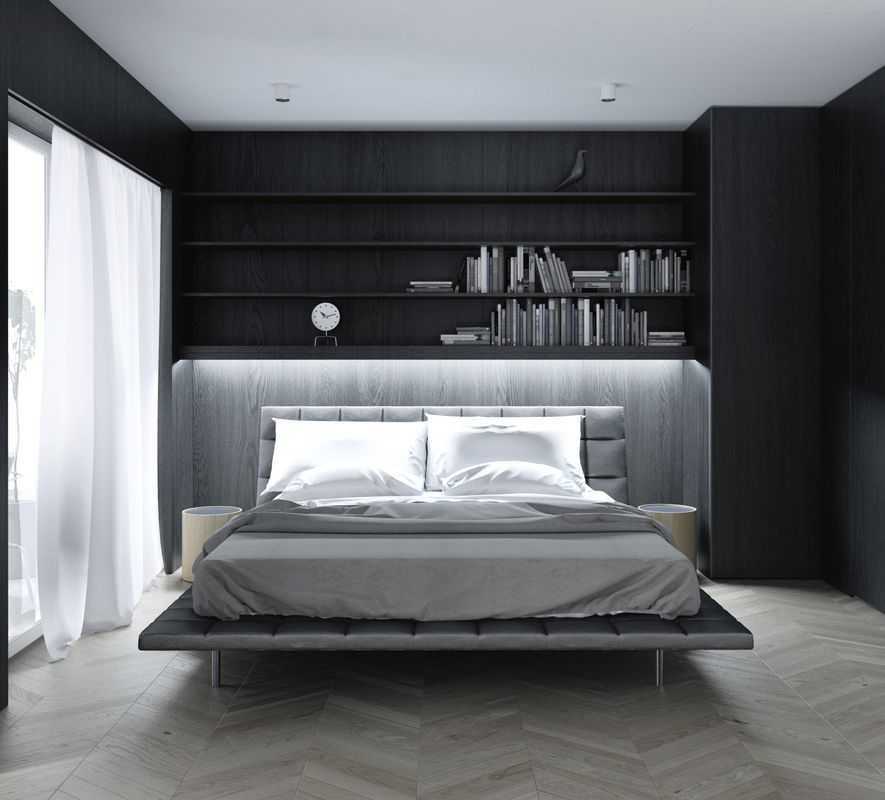 Проект чёрной спальни в стиле минимализм с двумя режимами светодиодной подсветки. В зависимости от включённого освещения комната преображается. Красный делает интерьер страстным и эмоциональным, а белый более спокойным. Чтобы избежать мрачной атмосферы для пола выбрано светлое деревянное покрытие.