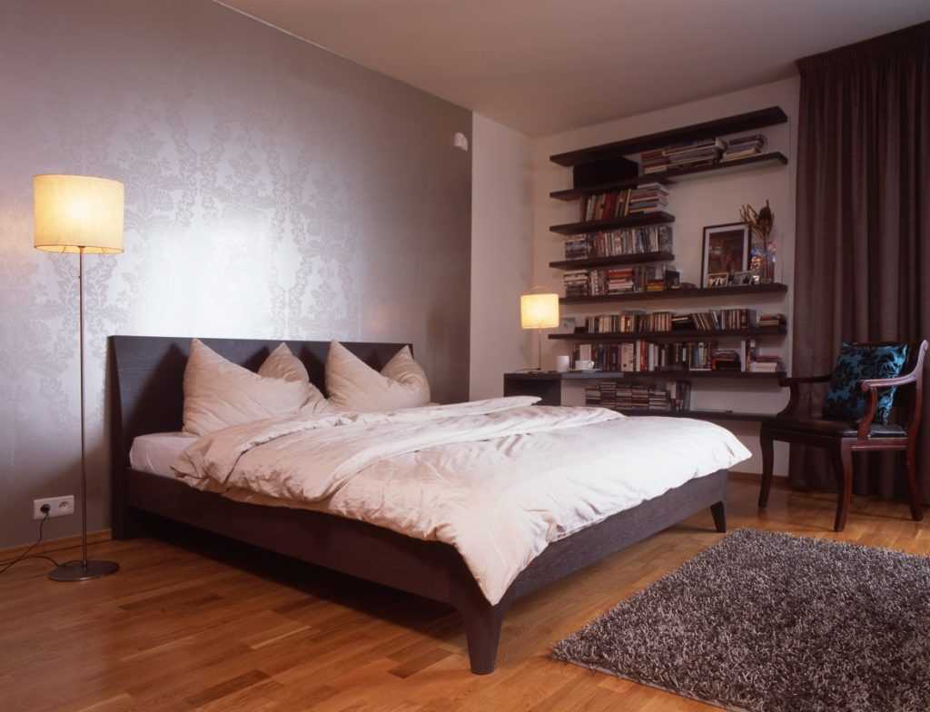Если нет предпочтений, кровать лучше выбрать средней высоты (50-60 см) и ширины (160-170 см). Прикроватные тумбочки можно заменить настенными полочками. Их лучше закрепить у изголовья на уровне вытянутой руки (в положении лежа), чтоб свободно брать и класть предметы. Для работы лучше использовать небольшую консоль с переносной настольной лампой или светильником, и дополнить его легким, задвижным стулом. Он не должен загромождать проход, когда им не пользуются.
