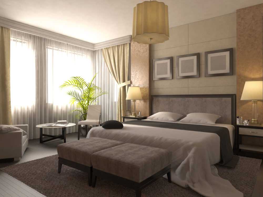 Следует учитывать, что спальня в бежевом цвете и в сочетании цвета беж с другими оттенками должна быть полностью разбавленной. То есть мебель не должна сливаться с полом, потолком, текстильными аксессуарами.