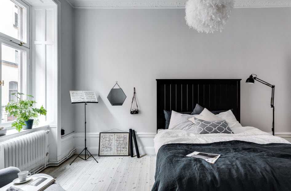 Отличным дизайнерским ходом будет добавление в спальню с черной кроватью (а также другой черной мебелью) белых элементов интерьера. Такая комната уже не будет казаться мрачной и подавляющей.
