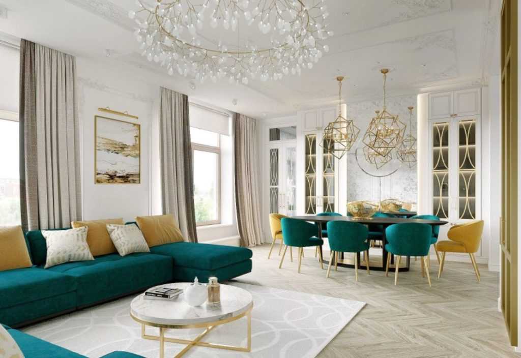 Неплохо смотрится изумрудный цвет в сочетании с белым и светло-серым. В гостиной стены красят в серый цвет, на окна вешают изумрудные шторы, в комнату ставят диван с белой обивкой и кресло с изумрудной. Сюда же подойдет круглый журнальный столик со столешницей под светлый мрамор.