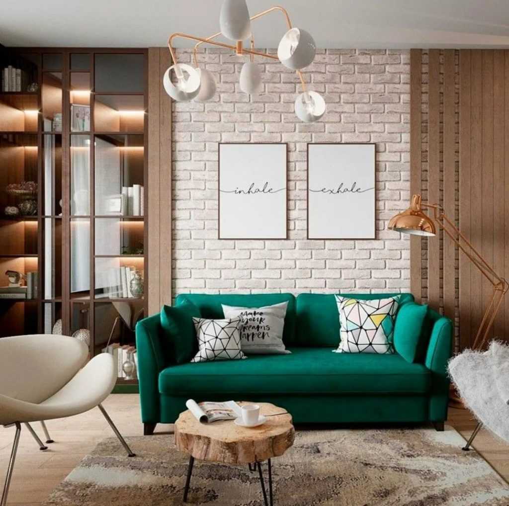Подобные сочетания уместны практически для всех помещений. Вы можете разместить изумрудный диван в скандинавском интерьере не только дома, но и в рабочем кабинете.