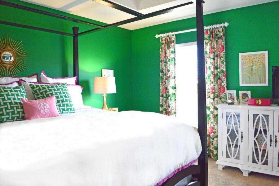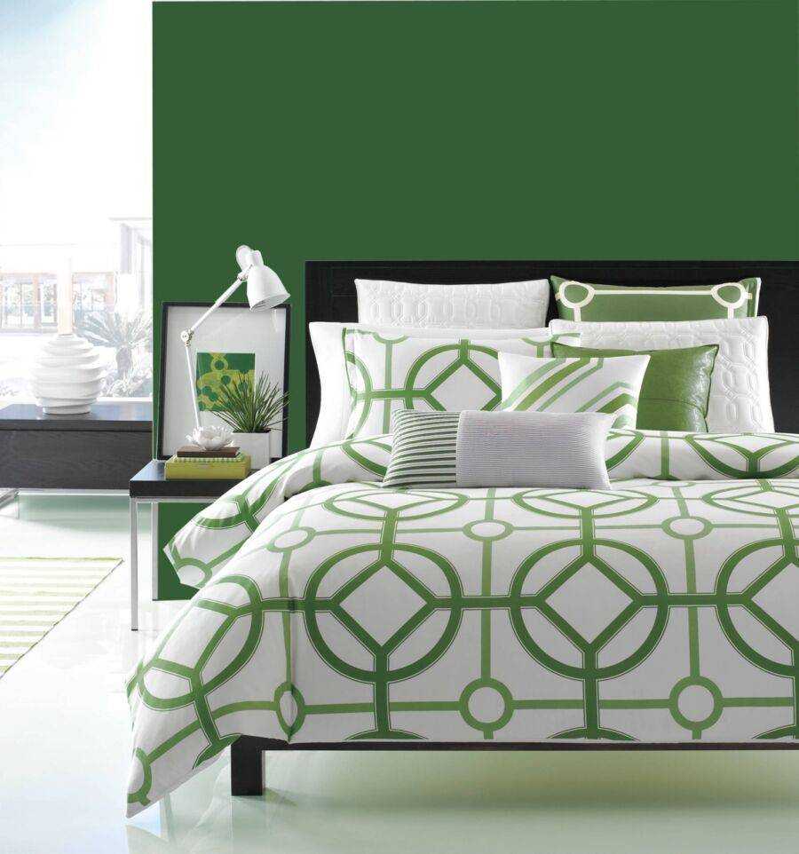 Если стены оформлены в белый, зеленое покрывало и подушки на кровати – лучший выбор. К белой отделке отлично подходят зеленые занавески или ковер. Главное — соблюдать цветовой баланс.