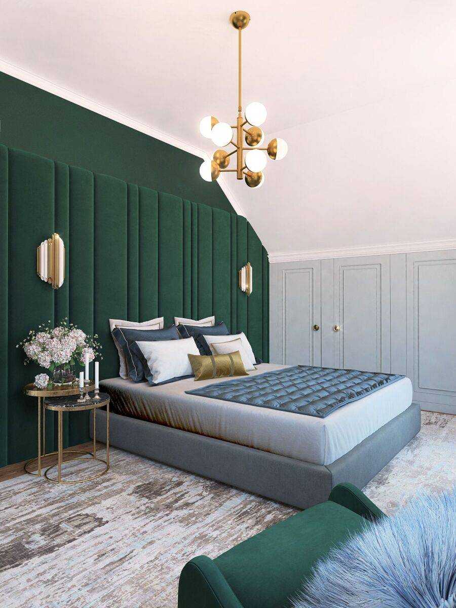Изумрудный оттенок сделает дизайн спальни роскошным и изысканным. Его можно использовать в отделке стен и потолков.