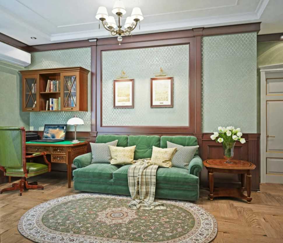 - Темно-зеленый оттенок гармонирует с кожаными обивками дивана и кресел.