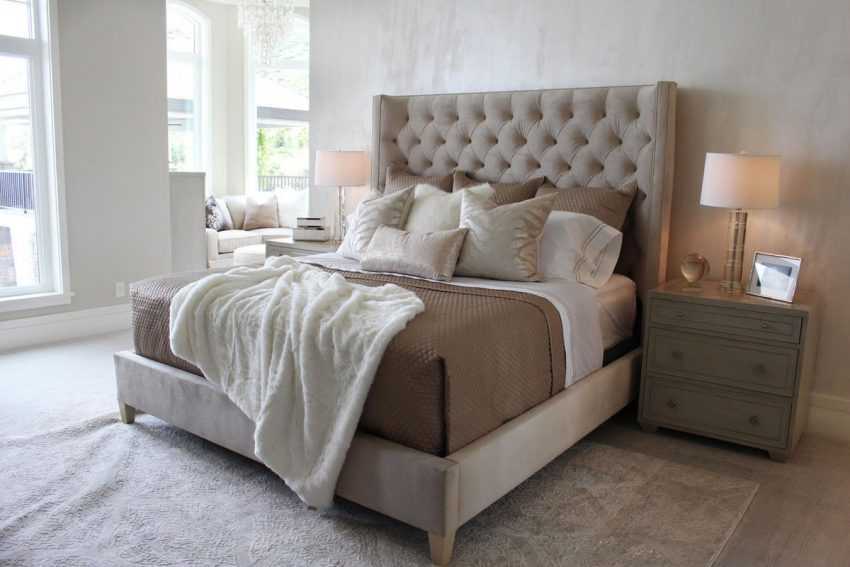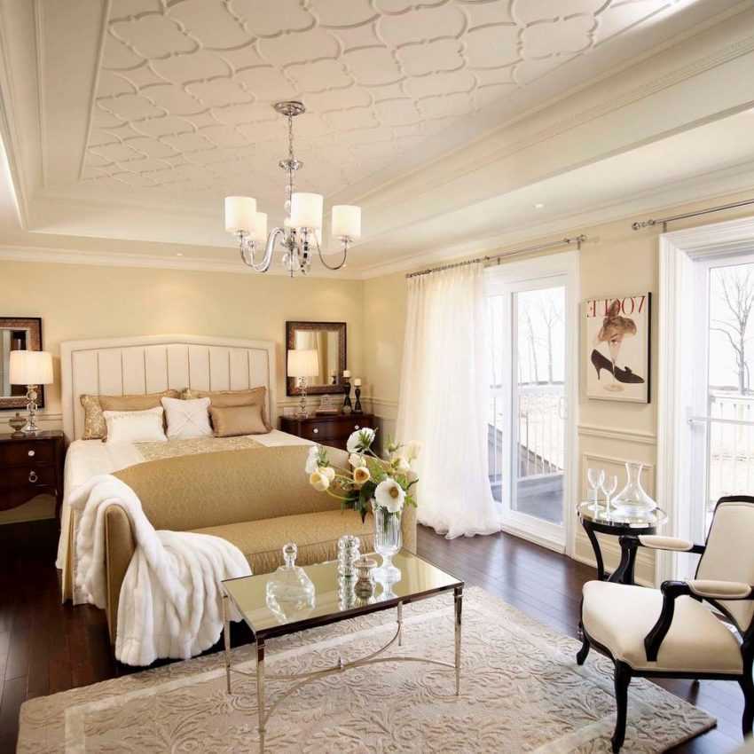 Рассмотрим несколько наиболее популярных композиций песочного цвета в интерьере опочивальни: