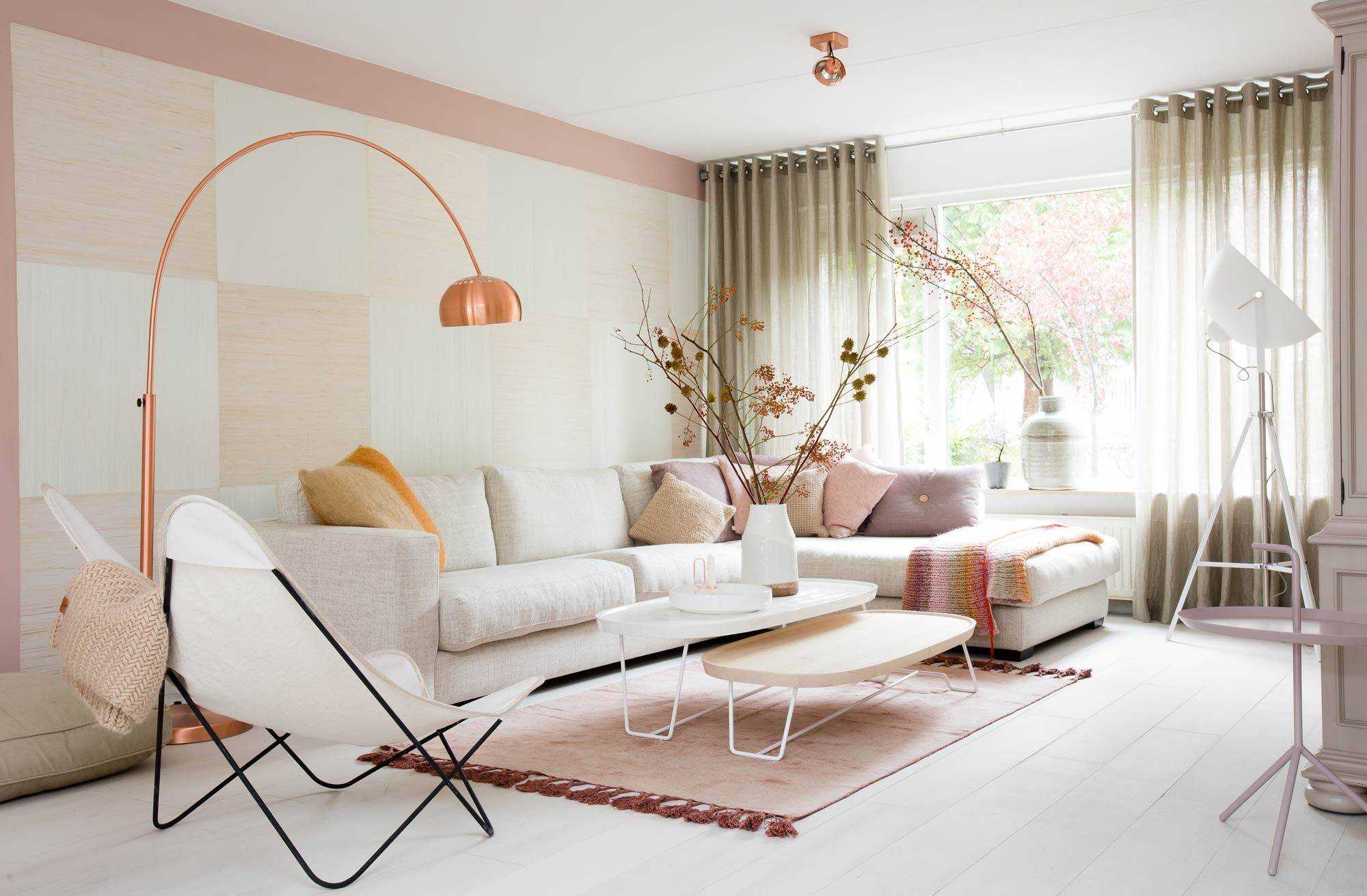 Наиболее спокойным оформлением будет в серо-розовой или бежево-розовой палитре. Для гармоничного образа комнаты, оттенок лучше использовать в деталях, например отделка мебели, портьеры или фрагменты стены.