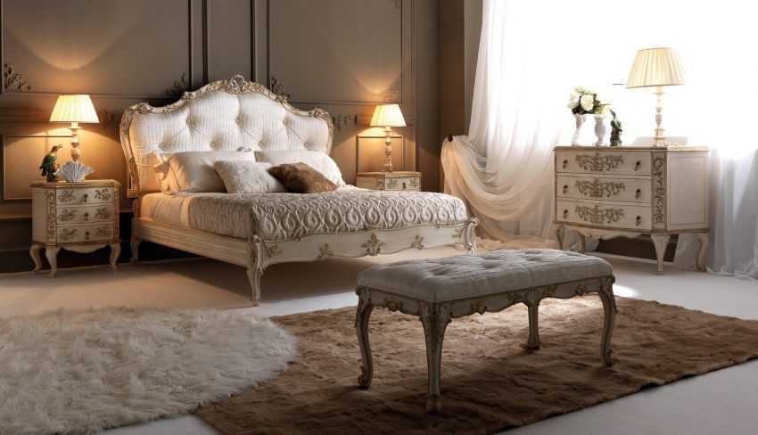 Подойдут и современные предметы мебели с хромированными деталями, но важно, чтобы вся мебель была сделана в едином стиле. Недопустимо располагать рядом, к примеру, массивное кресло с кожаной обивкой и стол со стеклянной столешницей на изящных ножках. Удачным выбором станет массивная кровать с просторным ложем, шкафы с зеркальными вставками на дверях, тумбы и мягкие пуфы светлого цвета