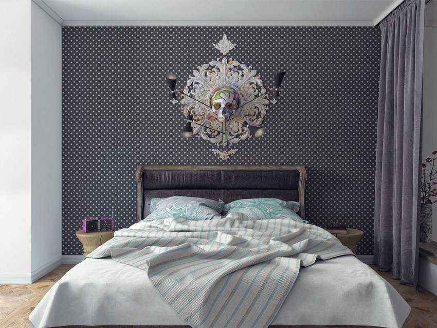 Спальню для мужчины обклеивают фактурными 3D обоями, рисунок выбирают графический.
