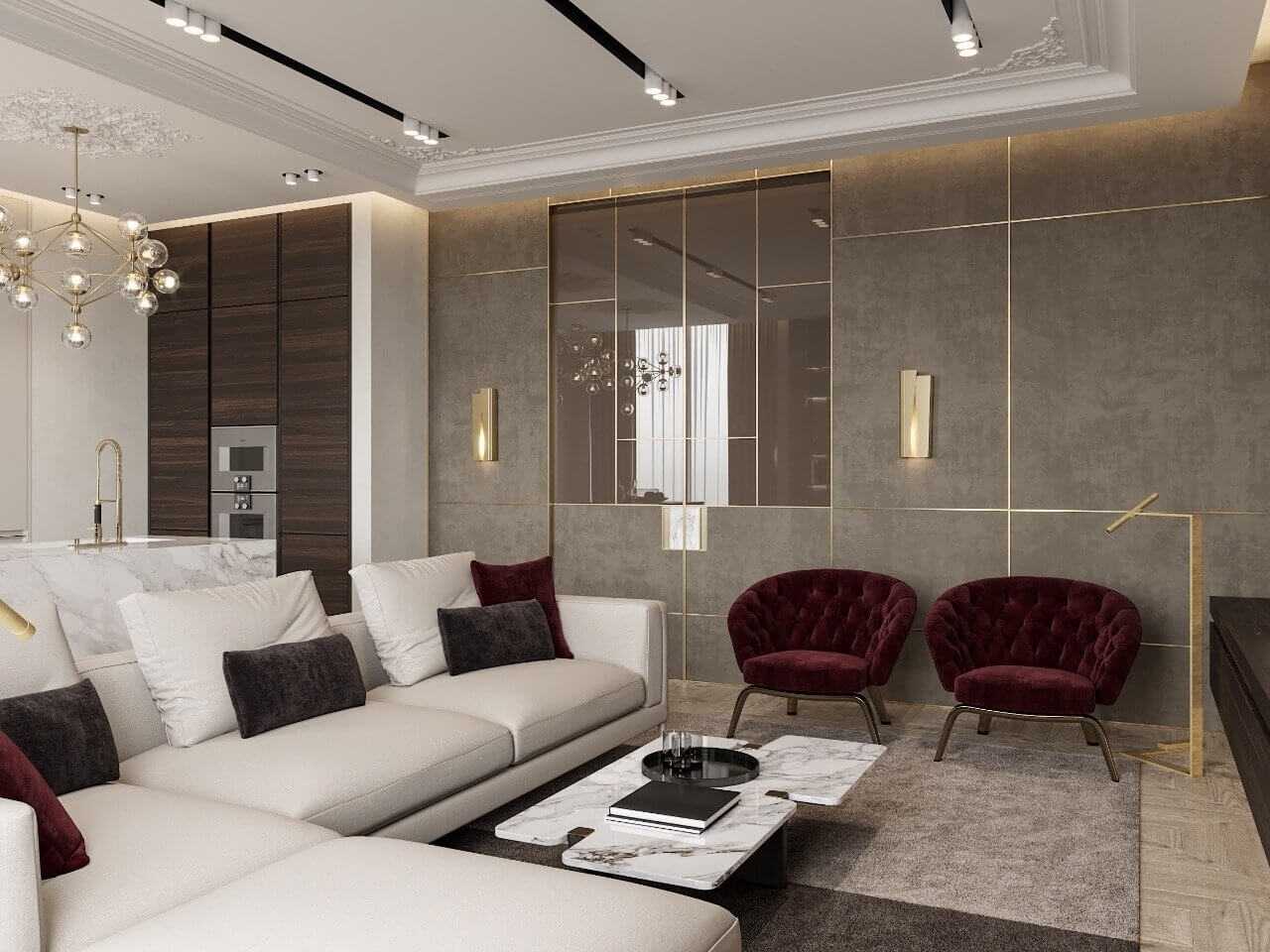 Потолки могут быть самыми обычными, но все же стоит предпочесть натяжные полотна и многоуровневые решения для зонирования, создания элегантного интерьера