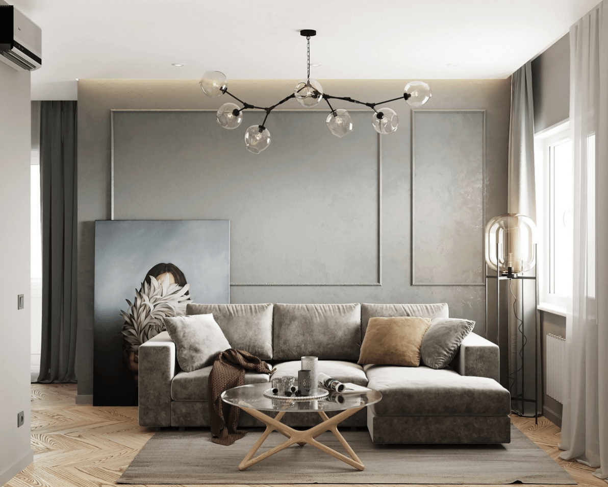 - Серый. На первый взгляд данный тон может показаться мрачным для отделки гостиной, но применяя его в виде отдельных вставок, можно подчеркнуть красоту декоративных элементов.