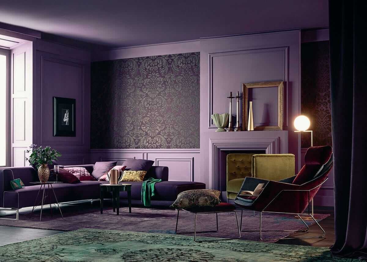 - Фиолетовый. Фиалковые или сиреневые тона встречаются в оформлении гостиных редко, но если их выбрать, комната поистине получится изысканной и оригинальной. Хорошо комбинировать фиолетовый с белым, розовым или светло-серым.