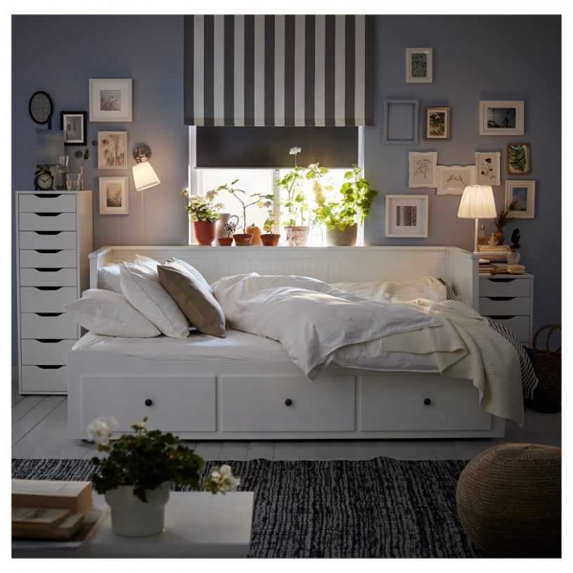 Хемнэс – очень известная мебель из ассортимента кроватей Ikea, в которой есть три ящика. Она выпускается только в белых цветах. Плюсами этого спального места являются: симпатичный дизайн, который подойдет к любой комнате, использование в производстве экологически чистых материалов, длительный срок использованя. Плюс, кроме мест для хранения вещей имеется также дополнительный выкатной ярус.