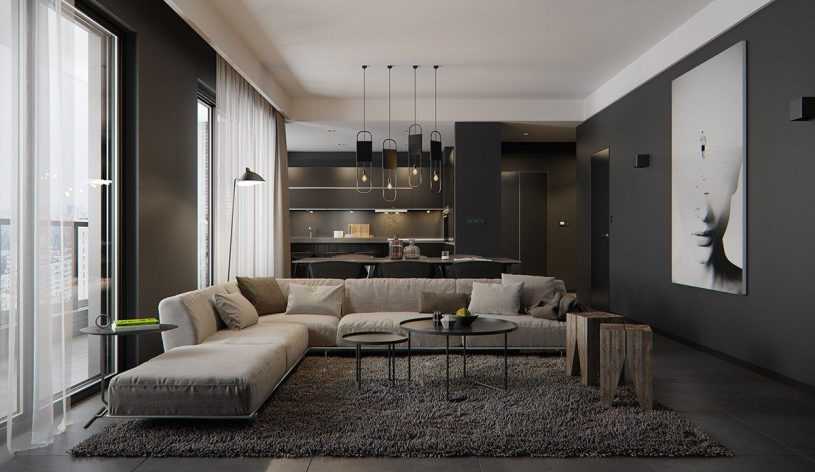Даже если плотно закрыть окна шторами, которые не позволят нежелательному свету проникнуть внутрь комнаты, мрачной она не будет выглядеть. В такой тональности лучше всего использовать мебель в классическом стиле.