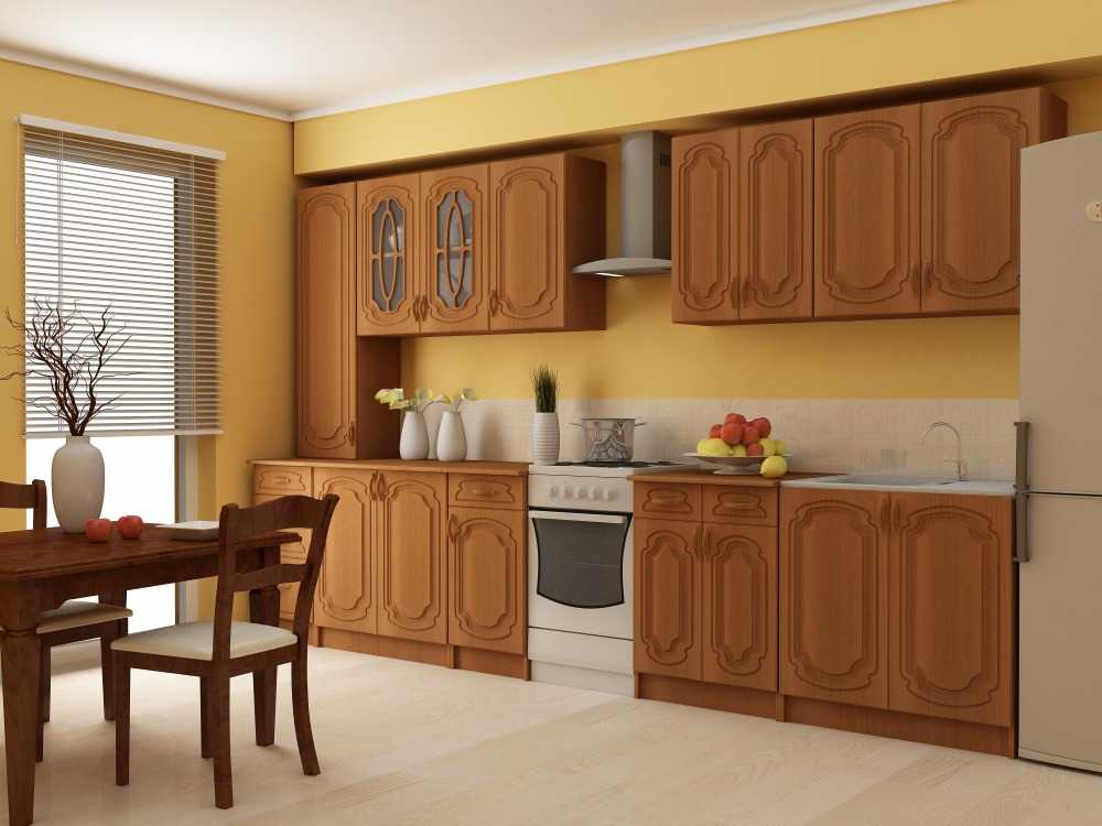 Если стенные панели на кухне желтые, ищите для нее шкафчики с синими вставками. Подходящее решение – использование древесных оттенков.