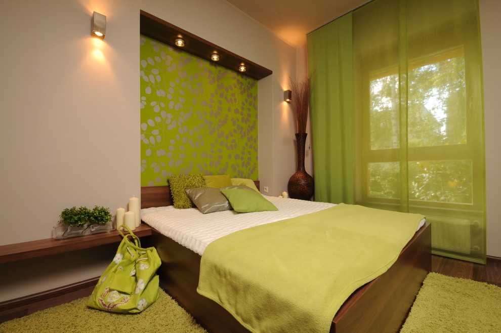 Изумрудный оттенок сделает интерьер спальни роскошным и изысканным. Его можно использовать в отделке стен и потолков. Светлые зелёные обои в спальне будут прекрасно сочетаться с белым, серебристым, бордовым, бронзовым, золотистым и нефритовым цветом текстиля, мебели и декора.