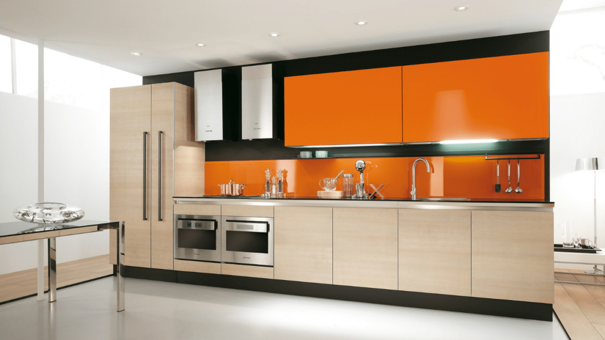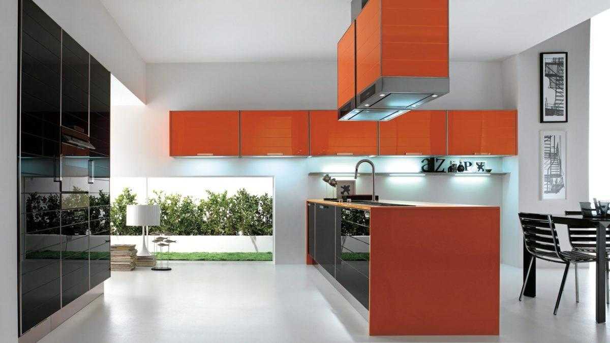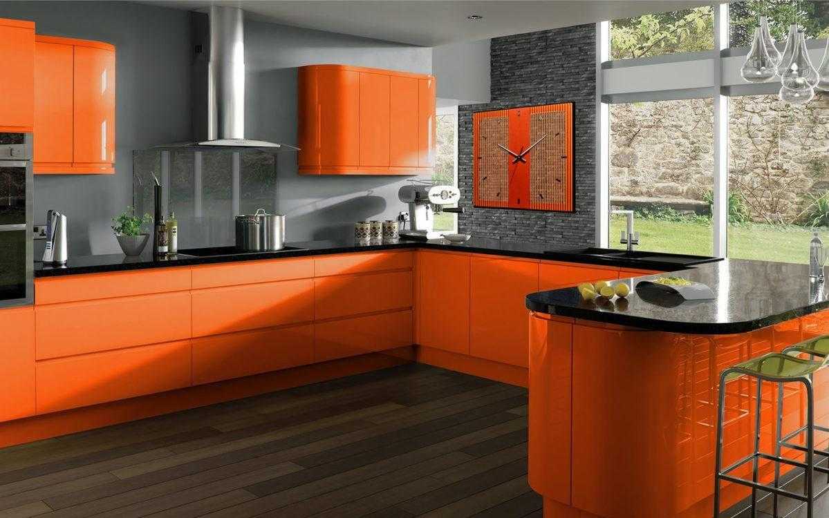Интерьер оранжевой кухни во многом зависит от элементов отделки, декора, установленной мебели.