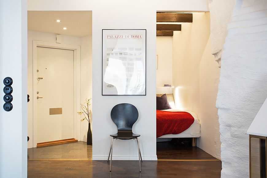 В проекте интерьера студийной квартиры дизайнер решил не тратить драгоценные квадратные метры на отдельную спальню и отгородил маленький уголок для кровати рядом с прихожей. Внутри уместился даже шкаф за занавеской. Мини комната не имеет двери.
