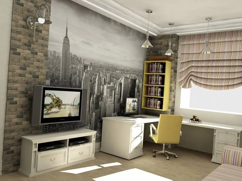 Мебель выбирают удобную. Но главное, чтобы она гармонично вписывалась в интерьер. Лучшим решением выступает покупка мебельной стенки, в которую уже входит встроенный письменный стол. Такой набор функционален и отлично подходит к лаконичному дизайну.