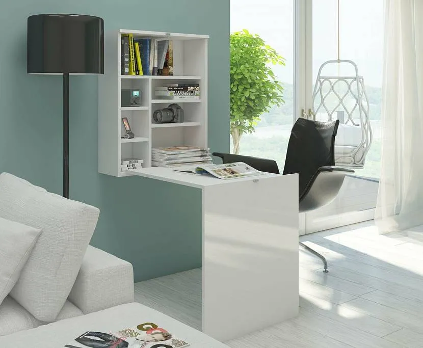 Отлично вписываются в небольшое пространство столы-подоконники или вмонтированные в стену. Наличие выдвижной секретной части выступает плюсом, поскольку туда можно прятать вещи после работы. И они не останутся на виду в комнате, которая предназначена для отдыха.