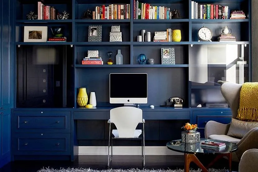 Рабочее место, обустроенное в гостиной стенке синего цветаИсточник yandex.by