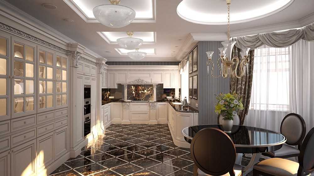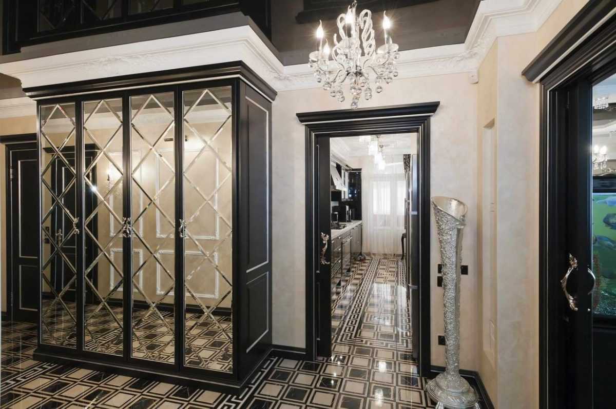 Пол: Идеальный вариант – белый или чёрный мрамор. Можно даже сочетать оба эти цвета, так как шахматный узор тоже превосходно подойдёт. Более экономный вариант – керамическая плитка (в первую очередь для ванной, туалета, кухни) или паркет (в коридор, жилые комнаты)