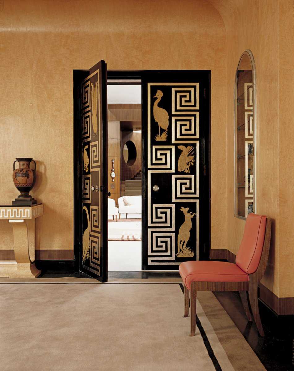 Межкомнатные двери в интерьерах art-deco рекомендуется устанавливать из натуральной древесины, с филёнками, стеклянными вставками или витражами с мифическими сюжетами. Дверные проёмы могут быть открытыми, оформленными полуколоннами с акантами и позолотой.