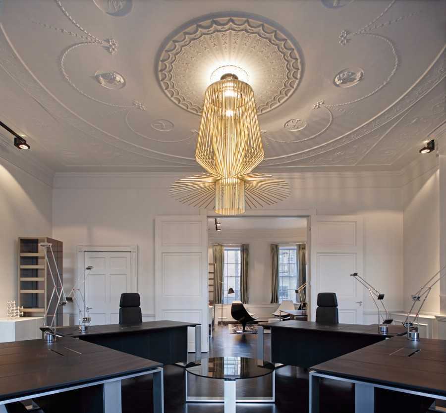 Каждый светильник должен стать определённым акцентом. При входе в комнату (любую) первой в глаза бросается роскошная люстра. Она может быть сделана из хрусталя, богемского стекла, хромированного или позолоченного металла, иметь крупные размеры и спускаться с потолка каскадом.