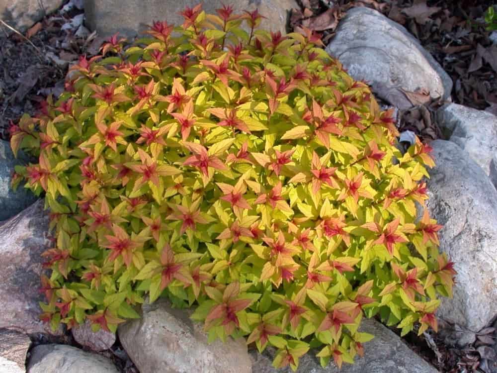 Многие формы спиреи японской имеют необычайно декоративную листву желтых и пурпурных оттенков.