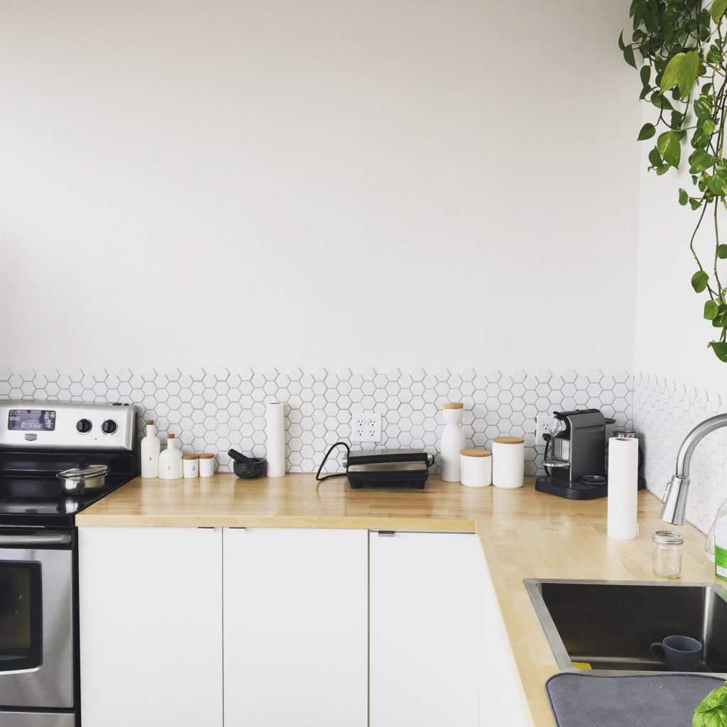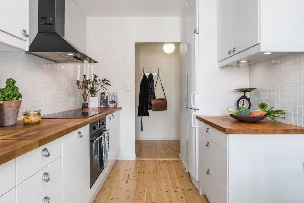 Белый — единственный цвет, который может быть основным во всех стилях дизайна. Деревянная столешница тоже вхожа в большинство актуальных стилей дизайна кухни.