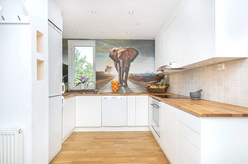Больше сказать про отделку стен для белой кухни нечего — этот крутой цвет всеяден, подойдет всё.