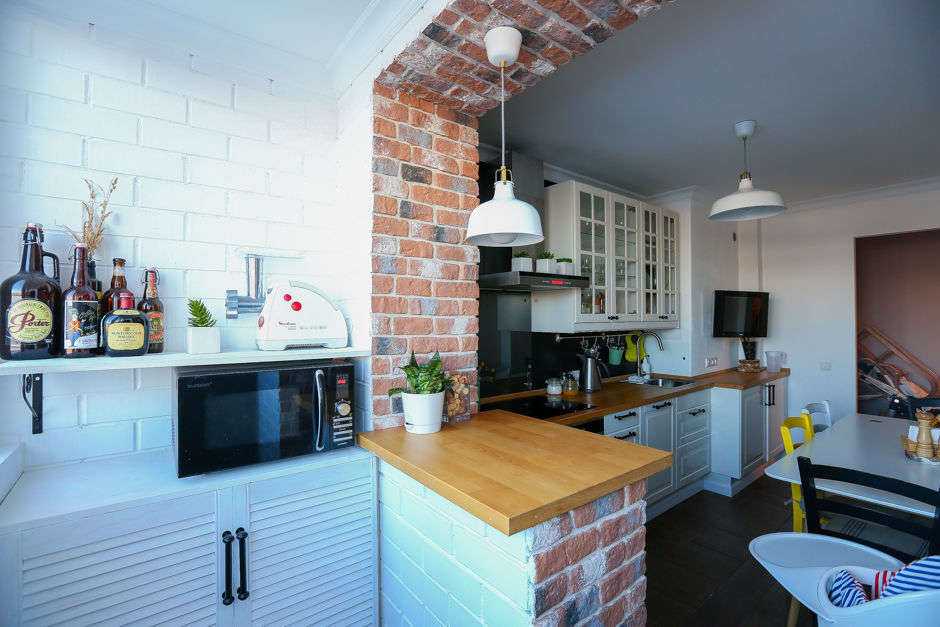 Перегородки, которые отделяют лоджию от кухни, можно снести лишь частично. Если оставить участок стены высотой с мебель, то, положив столешницу, легко продлить рабочую поверхность.