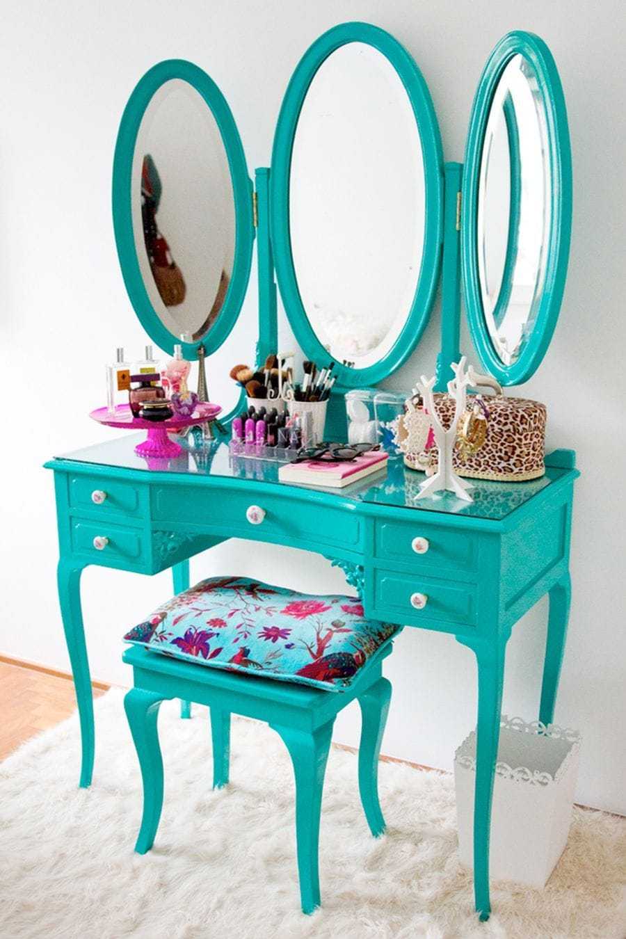 - Для девочки подростка можно выбрать небанальные, разноцветные модели или столы в ярких, например, желтых, лиловых, бирюзовых и других оттенках. Такой мебельный элемент организовывает порядок в хранении косметических средств и прививает молодой девушке аккуратность и чувство стиля.