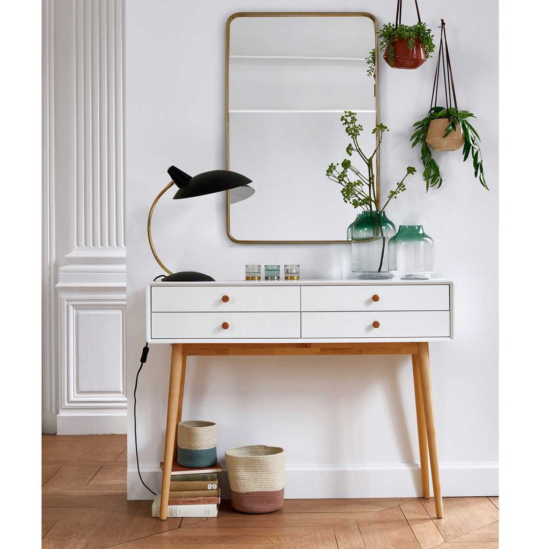 С помощью лаконичной консоли, получается создать отличное место для хранения различных мелочей и не перегрузить внешний вид прихожей.